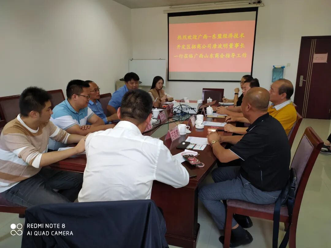 10月12日下午,广西-东盟经济技术开发区管委会主任助理、招商公司董事长唐波明、招商公司副总经理苗望舒、招商公司部门经理韦建令,信息部经理唐玉华、刘洋一行五人亲临广西山东商会,我会会长贾全顺、执行会长兼代理秘书长李元林、常务副会长兼副秘书长王志亮、副会长张士行等表示热烈欢迎,并组织召开了项目精准对接阶段性进展交流会。