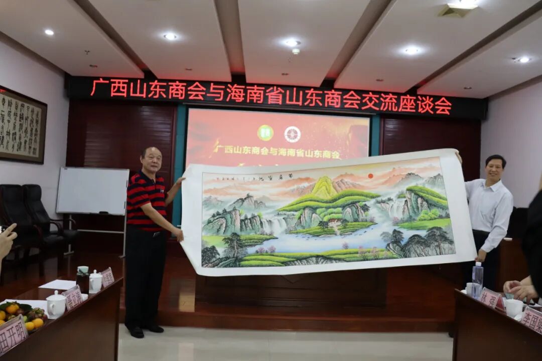 下午3:00两家商会进了座谈会,会议由执行会长兼代理秘书长李元林主持,他对海南省山东商会考察团的到来表示热烈的欢迎。并介绍我商会参加座谈会的主要代表。海南省山东商会秘书长高正霞介绍考察人员,座谈会在友好、热烈的氛围中开始。海南省山东商会执行会长刘文民代表本商会向我商会赠送了象征“落地生财、茁壮成长、平平安安”的青海玉石摆件,我商会会长贾全顺代表商会回赠名人“山水字画”一幅,寓意安居落业的美好大地。