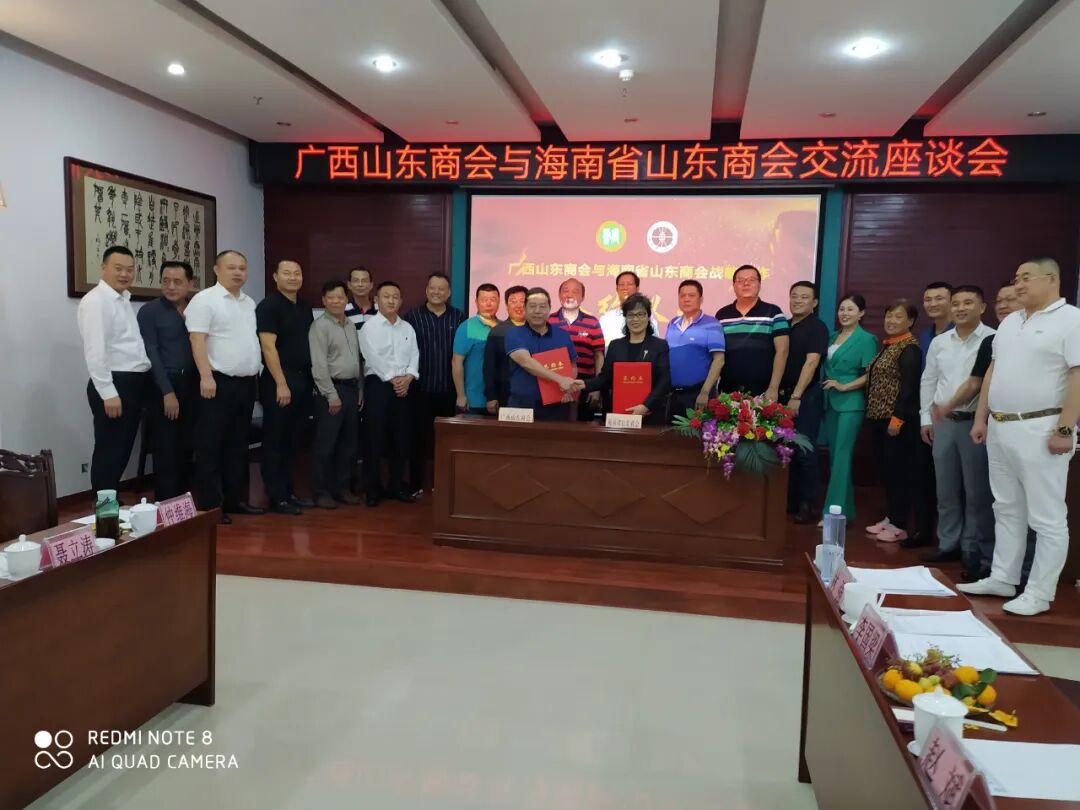 加强广西、海南两地山东商会发展,促进两会交流合作。2020年10月27日,海南省山东商会执行会长刘文民,秘书长高正霞,常务副会长丁庆磊(吴英代表)、郭昊、聂来龙,副会长董建锋、李兆甡、栾书金、赵斌、李国梁,常务理事林强,齐鲁制药集团销售总公司广西分公司总经理徐厚升、齐鲁制药集团销售总公司江西分公司总经理王文成,会员部主任徐晓明等一行14人莅临我商会交流学习,我商会会长贾全顺,执行会长兼代理秘书长李元林,执行会长、北海分会会长朱义东,执行会长、百色分会会长马龙,常务副会长兼党支部书记王士学,常务副会长兼副秘书长孟广现,常务副会长刘智、田开明,副会长聂立涛、何其栋、仲维海、徐兵、副会长兼副秘书长张士行等热情接待来宾,会长贾全顺带领海南省山东商会考察团一行参观了商会办公环境。